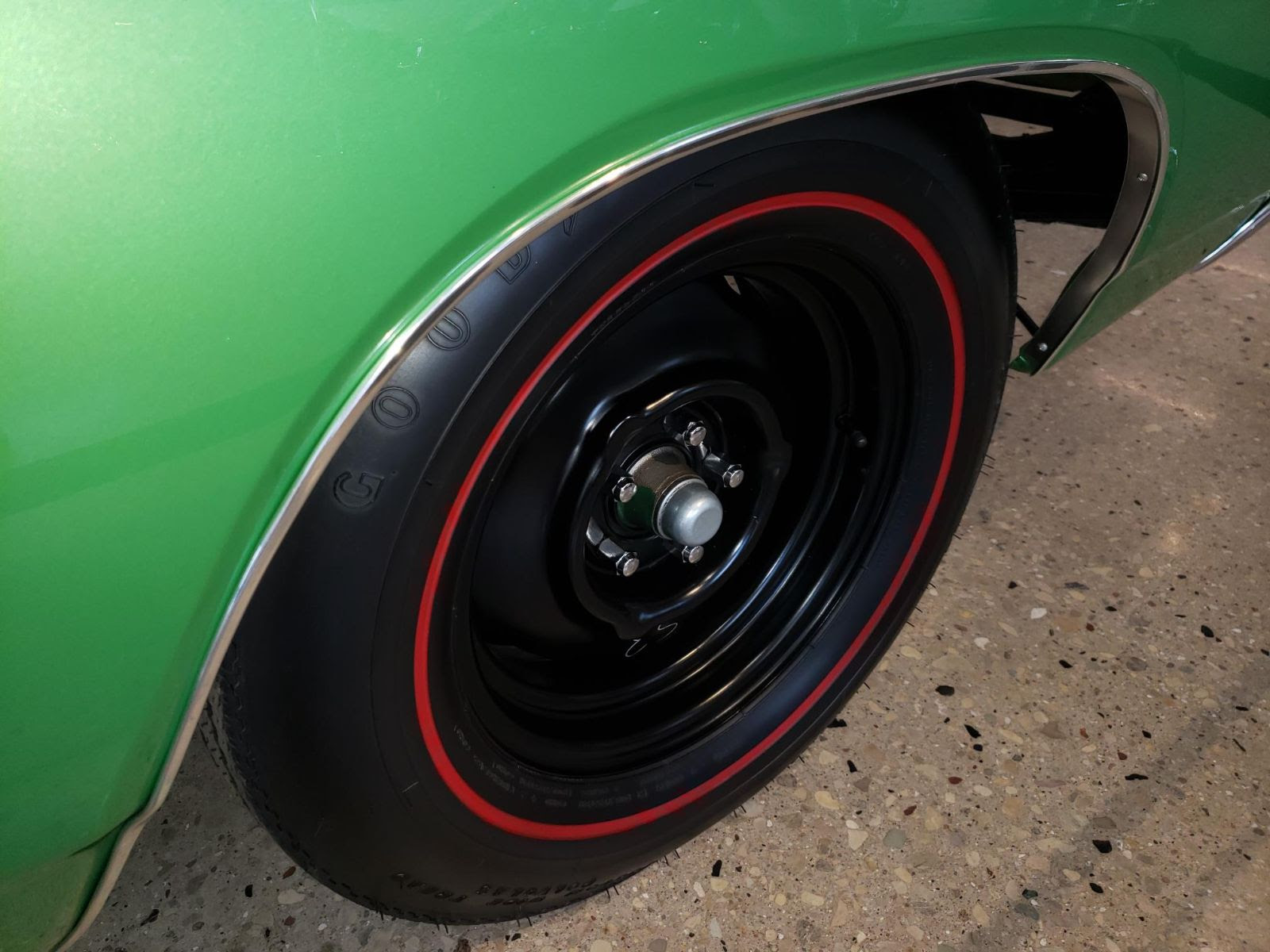 A striking 1969 ½ Dodge Super Bee in Bright Green paint gleams with its flat black fiberglass hood, chrome lug nuts, and Super Bee badging, embodying the raw power of a muscle car.